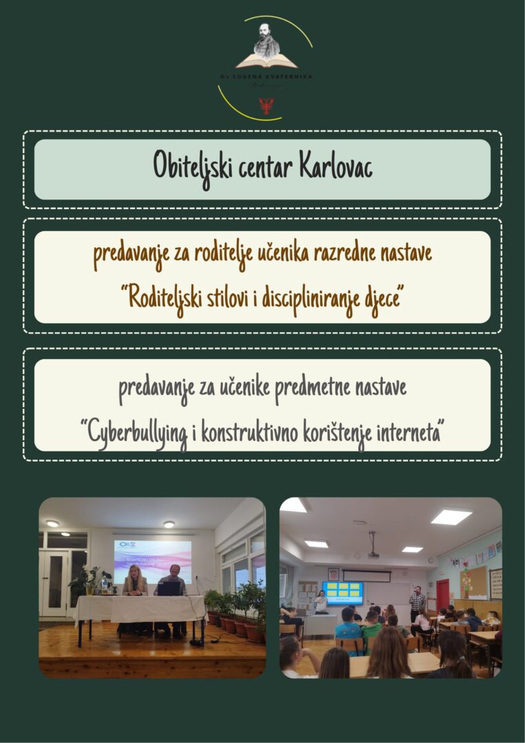 Zahvaljujemo djelatnicima Obiteljskog centra Karlovac na održanim predavanjima za roditelje i učenike. Pobliže su nam prikazali svoje područje rada te informirali roditelje učenika razredne nastave o aktualnim temama: roditeljskim stilovima i discipliniranju djece. Također, održali su zanimljivo i korisno predavanje za učenike predmetne nastave o cyberbullyingu i konstruktivnom korištenju interneta.